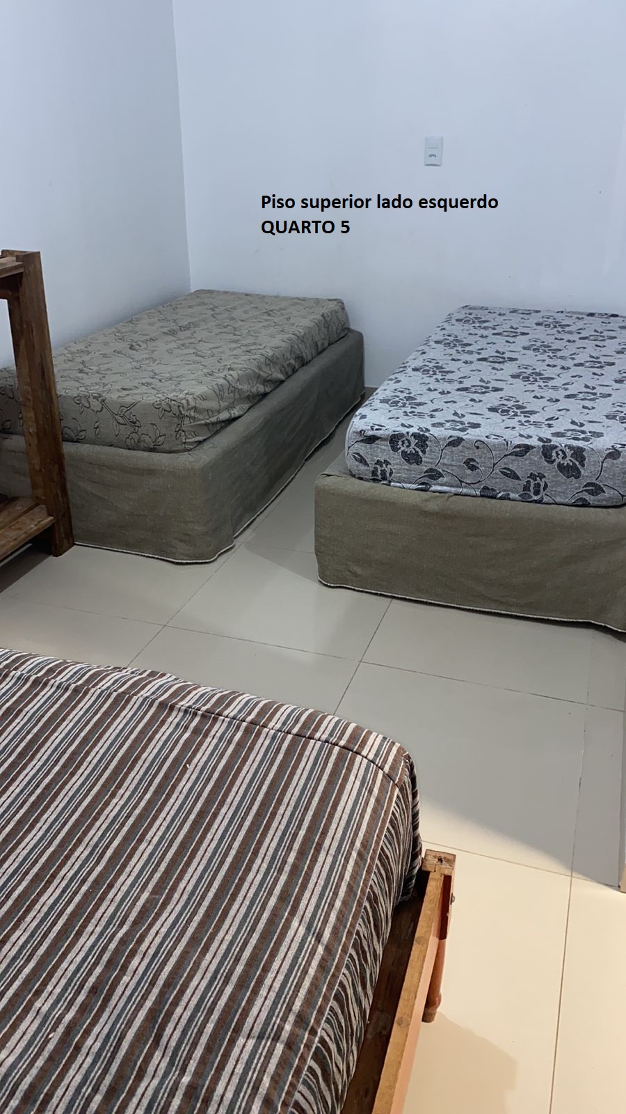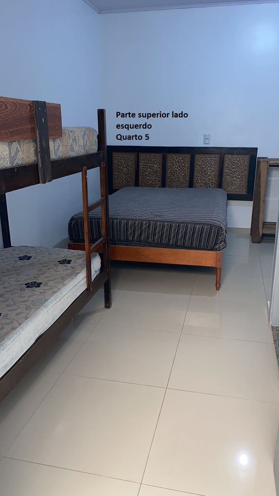 Quarto 5: parte superior lateral esquerdo 1 cama casal, 2 solteiro e 1 beliche: 6 pessoas